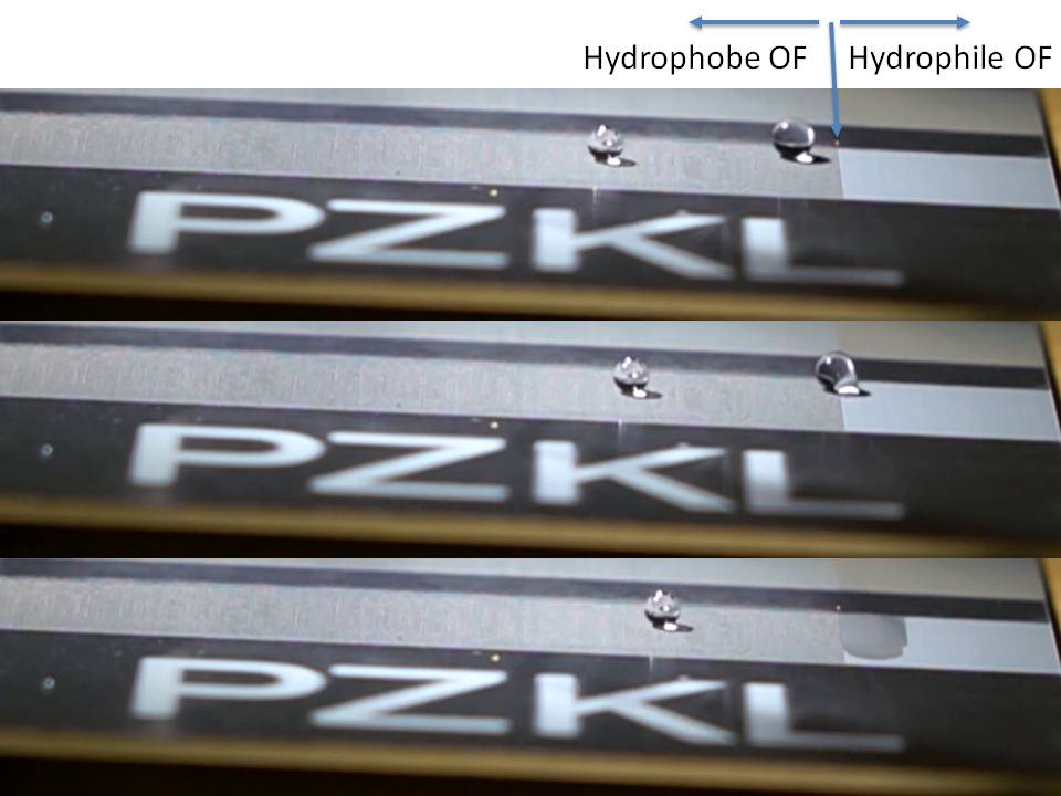 Das definierte Einstellen der Benetzbarkeit von Oberflächen ist entscheidend für viele moderne Applikationen. Je nach Anwendung müssen Oberflächen hydrophil (bzw. oleophil) oder hydroph (bzw. oleophob) sein. Abtragende Laserverfahren oder Plasmaprozesse erlauben die effiziente und auch selektive Einstellung dieser Eigenschaften. Schmutzabweisende Oberflächen auf Displays, Brillen oder optischen Baugruppen werden ebenso möglich wie die homogene Verteilung von Schmiermitteln auf beanspruchten Grenzflächen. Dabei arbeiten wir beispielsweise an Applikationen gleichermaßen auf Gläsern und kristallinen Materialien wie auf Metallen.